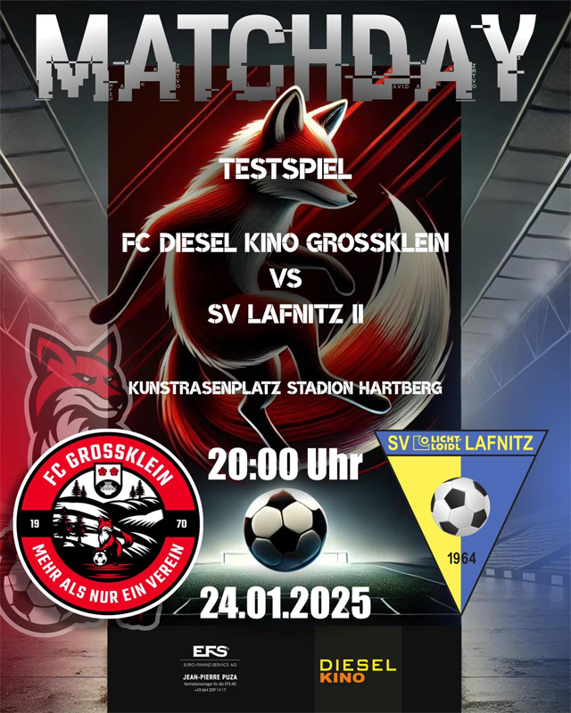 1. Testspiel KM I – am Freitag, 24.01.2025 gegen Landesligist SV Lafnitz Amat. 23/01/2025FCG SV Lafnitz Amat. (LL) vs. FC Diesel Kino Großklein Freitag, 24.01.2025, 20:00 Uhr, Kunstrasenplatz Stadion Hartberg Teilen: Klicke, um auf X zu teilen (Wird in neuem Fenster geöffnet) X Klick, um auf Facebook zu teilen (Wird in neuem Fenster geöffnet) Facebook Gefällt mir Wird geladen …