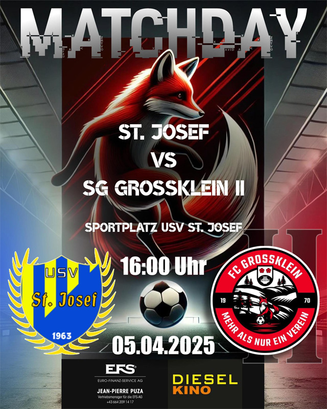 KM II – 17. Runde: am Samstag, 05.04.2025 gastiert die SG Großklein II beim USV St. Josef! 02/04/2025FCG USV St. Josef vs. SG Großklein II Samstag, 05.04.2025, 16:00 Uhr in St. Josef Meisterschaftsspiel – 17. Runde – 1. Klasse/West Teilen: Klicke, um auf X zu teilen (Wird in neuem Fenster geöffnet) X Klick, um auf Facebook zu teilen (Wird in neuem Fenster geöffnet) Facebook Gefällt mir Wird geladen …