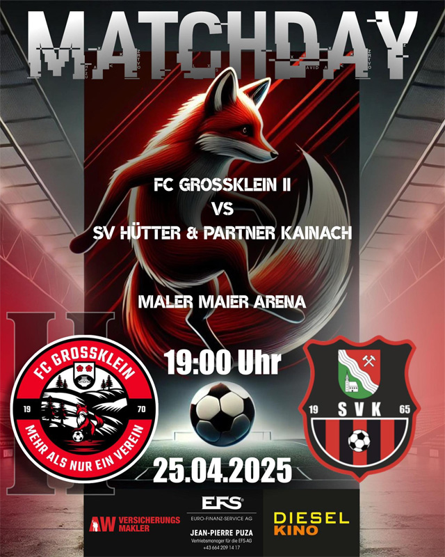 KM II – 20. Runde: Heimspiel gegen den SV Kainach am Freitag, 25.04.2025! 24/04/2025FCG SG Großklein II vs. SV Kainach Freitag, 25.04.2025, 19:00 Uhr in der Maler Maier Arena Großklein Meisterschaftsspiel – 20. Runde – 1. Klasse West Teilen: Klicke, um auf X zu teilen (Wird in neuem Fenster geöffnet) X Klick, um auf Facebook zu teilen (Wird in neuem Fenster geöffnet) Facebook Gefällt mir Wird geladen …