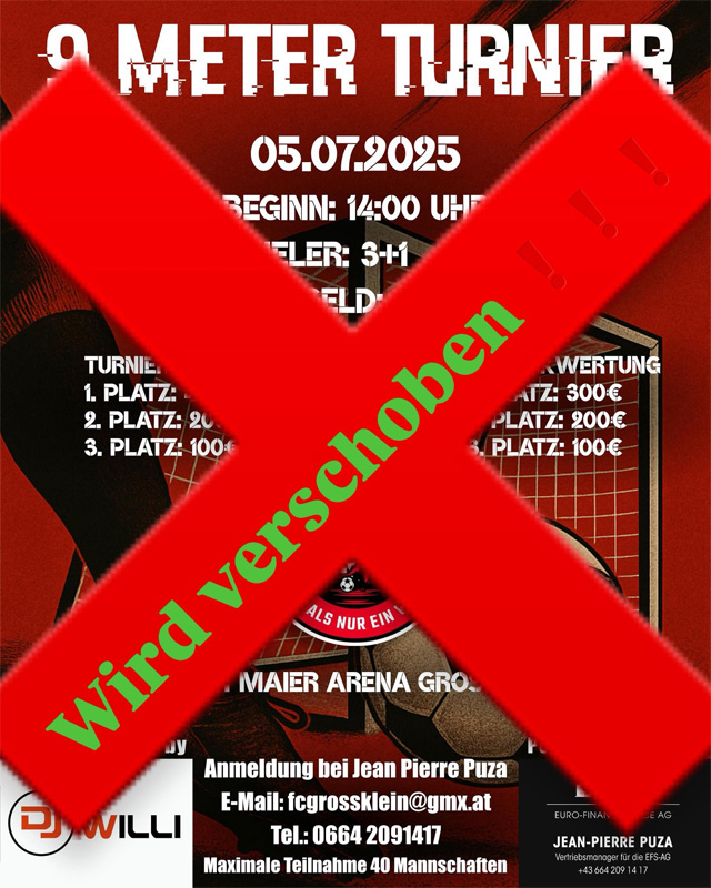 9-Meter Turnier wird verschoben! 23/06/2025FCG Das für 05.07.2025 angesetzte 9-Meter Turnier wird auf August verschoben! Sobald das neue Datum feststeht geben wir natürlich rechtzeitig Bescheid! Teilen: Klicke, um auf X zu teilen (Wird in neuem Fenster geöffnet) X Klick, um auf Facebook zu teilen (Wird in neuem Fenster geöffnet) Facebook Gefällt mir Wird geladen …