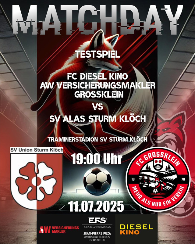 1. Testspiel KM I – am Freitag, 11.07.2025 auswärts gegen SV Union Sturm Klöch! 10/07/2025FCG SV Union Sturm Klöch (ULS) vs. FC Diesel Kino AW Versicherungsmakler Großklein Freitag, 11.07.2025, 19:00 Uhr in Klöch Teilen: Klicke, um auf X zu teilen (Wird in neuem Fenster geöffnet) X Klick, um auf Facebook zu teilen (Wird in neuem Fenster geöffnet) Facebook Gefällt mir Wird geladen …
