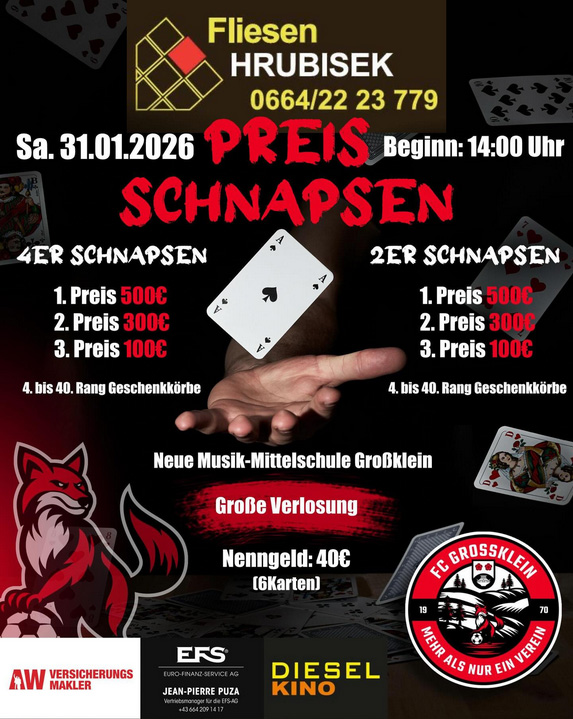 Der FC Diesel Kino AW Versicherungsmakler Großklein bedankt sich bei allen Sponsoren, Fans, Helfern und Funktionären für die Unterstützung und Zusammenarbeit in diesem Jahr, wünscht allen eine frohe Weihnachtszeit und einen guten Rutsch ins Jahr 2026!